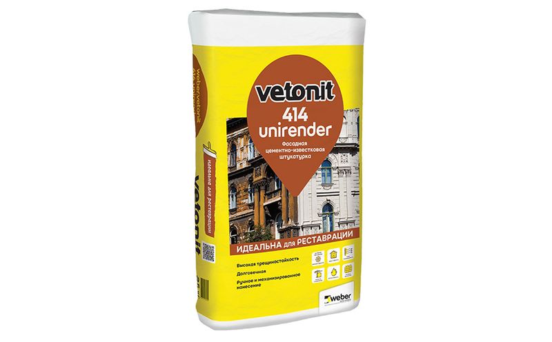 Оптимальное соотношение цемента и извести в материале, позволяет использовать weber.vetonit 414 Unirender, как при новом строительстве, так и при реконструкции старых зданий и сооружений. Цемент придает затвердевшему материалу первоначальную прочность необходимую для проведения дальнейших работ и не создает значительных внутренних напряжений при высыхании. Окончательный набор прочности происходит под влиянием известкового связующего. Содержащиеся в смеси микроволокна, способствуют повышенной трещиностойкости затвердевшего раствора. Штукатурный раствор можно наносить вручную или растворонасосом.